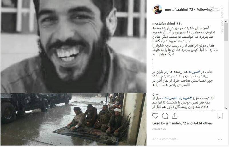 یک کاربر فضای مجازی در اینستاگرام با انتشار تصویری از شهید ابراهیم هادی و تصویری از نماز جماعت خواندن چند رزمنده در سوریه نوشت:
