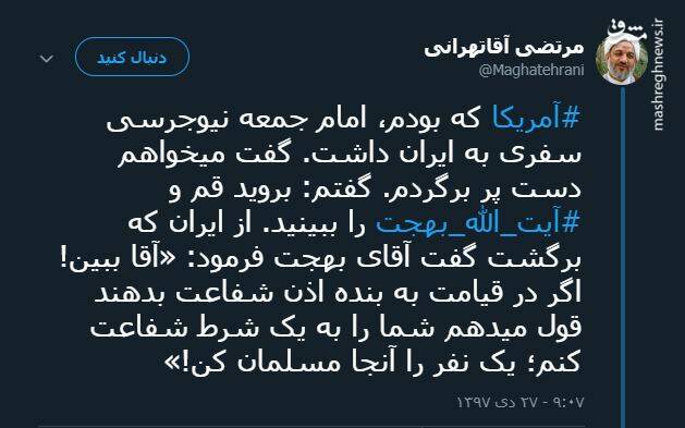 آمریکا که بودم امام جمعه نیوجرسی سفری به ایران داشت.گفت میخواهم دست پر برگردم.گفتم:بروید قم و آیت الله بهجت را ببینید.از ایران که برگشت گفت اقای بهجت فرمود:آقا ببین!اگر در قیامت به بنده اذن شفاعت بدهند قول میدهم شما را به یک شرط شفاعت کنم.یک نفر را انجا مسلمان کن.