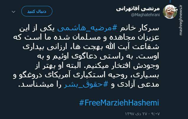 سرکار خانم مرضیه هاشمی یکی از این عزیزان مجاهده و مسلمان شده ما است که شفاعت آیت الله بهجت ها,ارزانی بیداری اوست.به راستی دعاگوی اوئیم و به وجودش افتخار میکنیم.البته او بهتر از بسیاری,روحیه استکباری آمریکای دروغگو و مدعی آزادی و حقوق بشر را میشناسد.