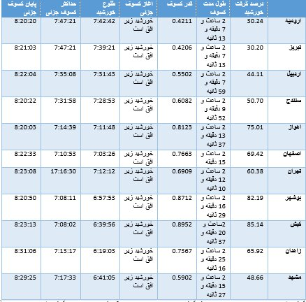 وی افزود: گرفتگی تام خورشید ساعت 7:16 دقیقه خواهد بود و در این 4 دقیقه نمی توان نماز خواند بلکه باید صبر کنیم تا از ساعت 7:16 به بعد نماز را آغاز کنیم، اتمام خورشید گرفتگی هم در ساعت 8:22 خواهد بود و یک ساعت و خرده ای گرفتگی خورشید اتفاق می افتد و از خواندن نماز آیات در مدت خورشید گرفتگی نباید غفلت کرد.