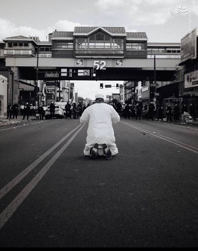 به نقل از ستاد اقامه نماز، در ذیل تصویر نماز خواندن سیاهپوست مسلمان در مقابل صف پلیس در شهر فیلادلفیا آمریکا را مشاهده میکنید.