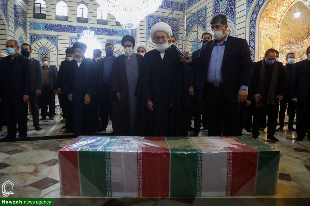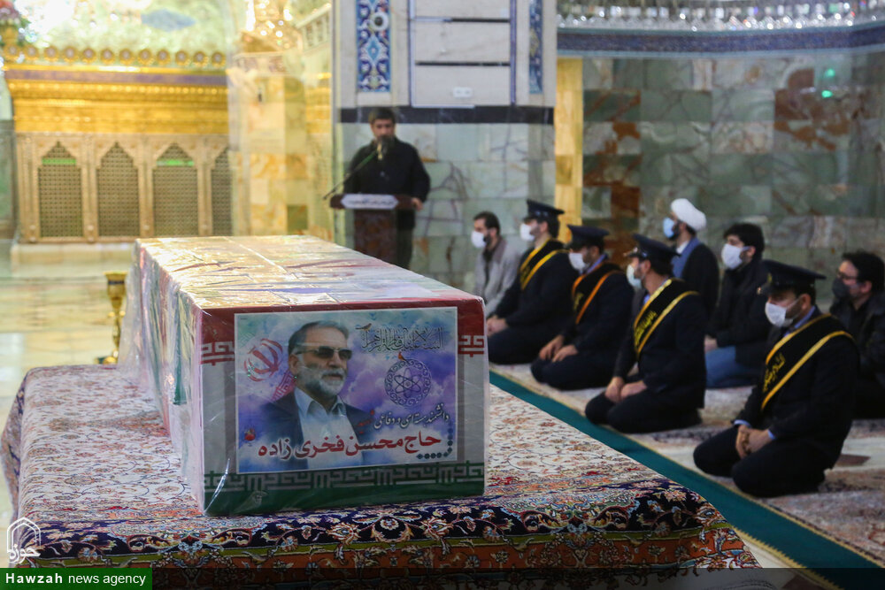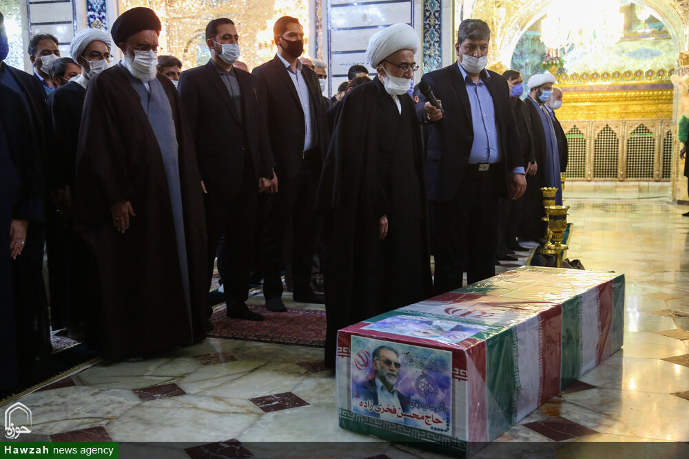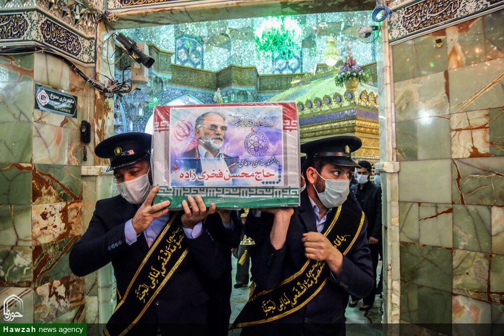 پیکر شهید فخری زاده در حرم حضرت معصومه سلام الله علیها طواف داده میشود و آیت الله العظمی نوری همدانی بر پیکر این دانشمند شهید اقامه نماز می کنند.