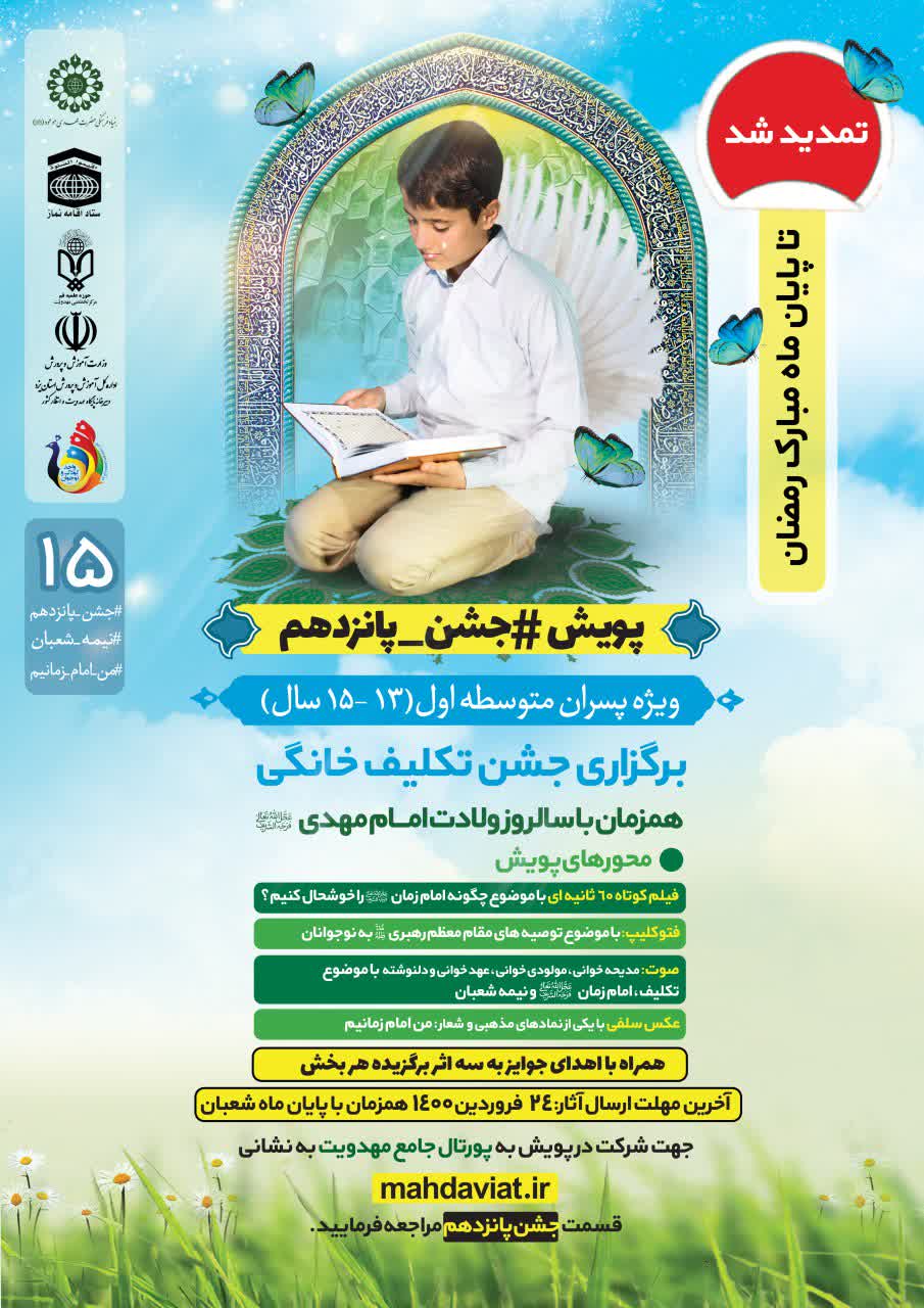 به گزارش روابط عمومی ستاد اقامه نماز کشور، پویش «جشن پانزدهم» ویژه پسران متوسطه اول(۱۳–۱۵سال) که همزمان با نیمه شعبان سالروز ولادت امام زمان(علیه السلام) آغاز شده بود تا پایان ماه مبارک رمضان تمدید شد.