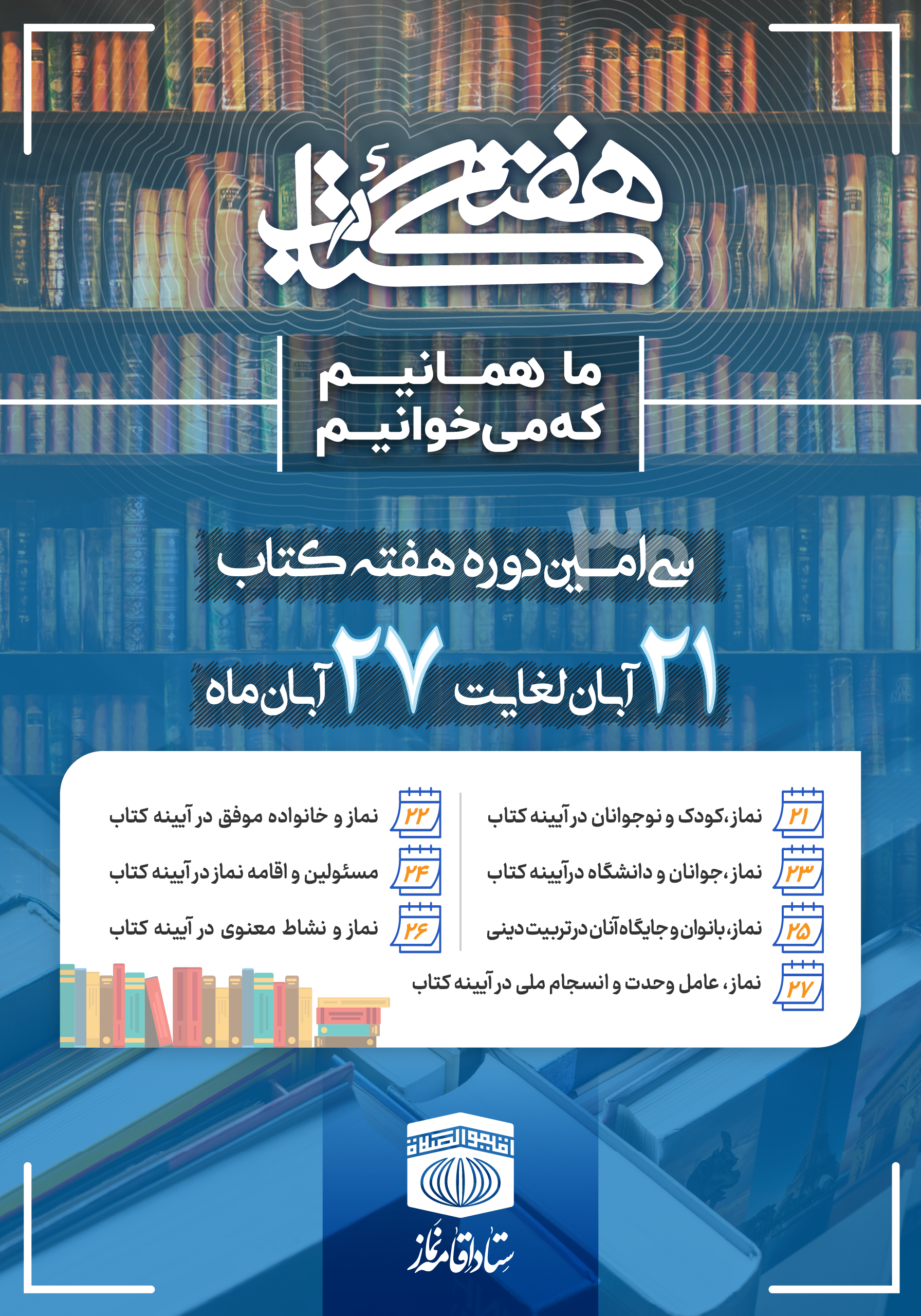 ستاد اقامه نماز با مشارکت خانه کتاب در برنامه ها و فعالیت های سی امین دوره از هفته کتاب و کتابخوانی با شعار “ما همانیم که میخوانیم” از ۲۱ آبان لغایت ۲۷ آبان با هدف ترویج فرهنگ کتابخوانی در جامعه برگزار می کند.