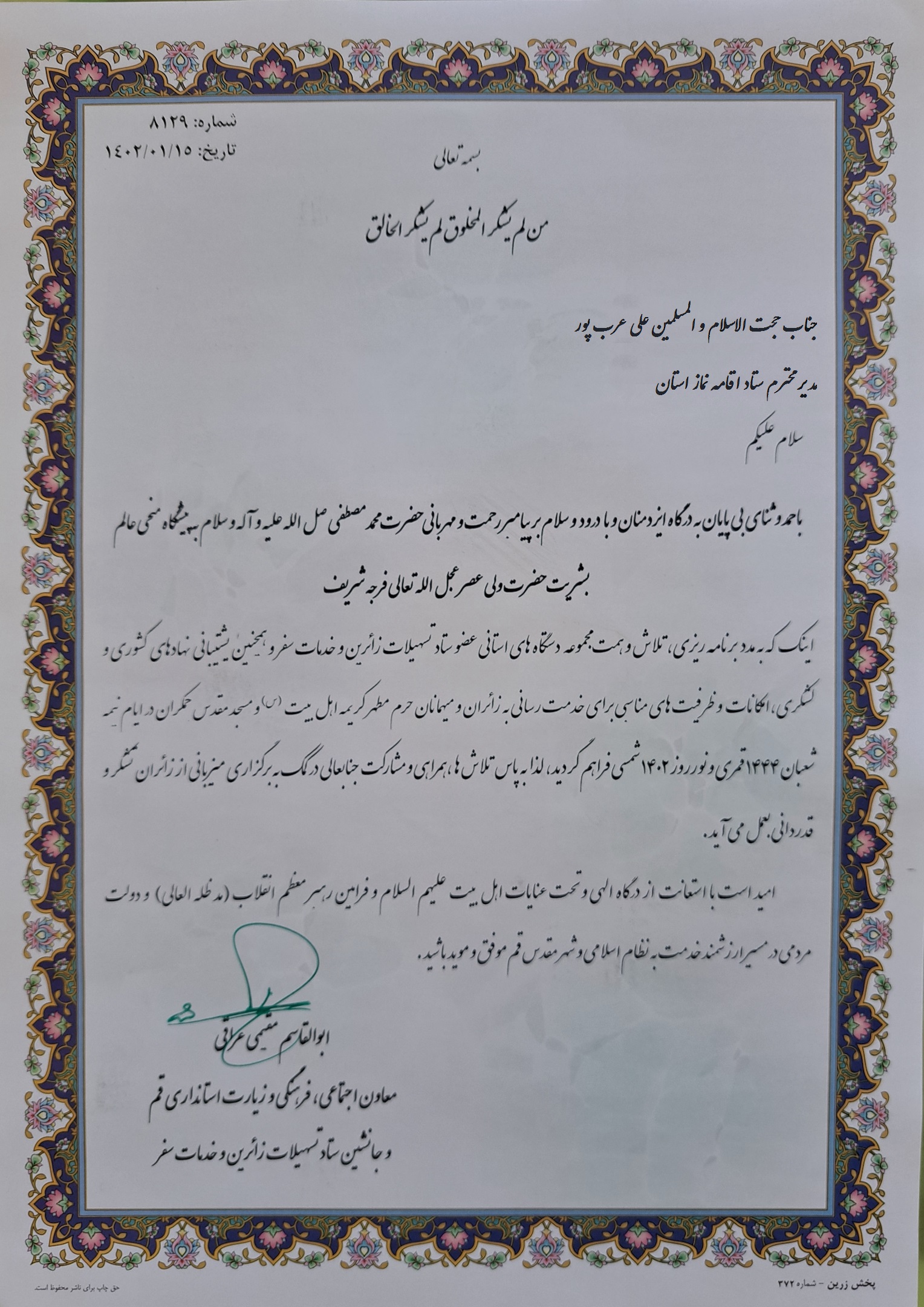 با حمد و ثنای بیپایان به درگاه ایزد منان و با درود و سلام بر پیامبر رحمت و مهربانی حضرت محمد مصطفی صلی الله علیه و آله و سلم به پیشگاه منجی عالم بشریت حضرت ولی عصر عجل الله تعالی فرجه شریف اینک که به مدد برنامه ریزی، تلاش و همت مجموعه دستگاههای استانی عضو ستاد تسهیلات زائرین و خدمات سفر و همچنین پشتیبانی نهادهای کشوری و لشکری، امکانات و ظرفیتهای مناسبی برای خدمت رسانی به زائران و میهمانان حرم مطهر کریمه اهل بیت(س) و مسجد مقدس جمکران در ایام نیمه شعبان ۱۴۴۴ قمری و نوروز ۱۴۰۲ شمسی فراهم گردید، لذا به پاس تلاشها، همراهی و مشارکت جنابعالی در کمک به برگزاری میزبانی از زائران تشکر و قدردانی بعمل میآید.
