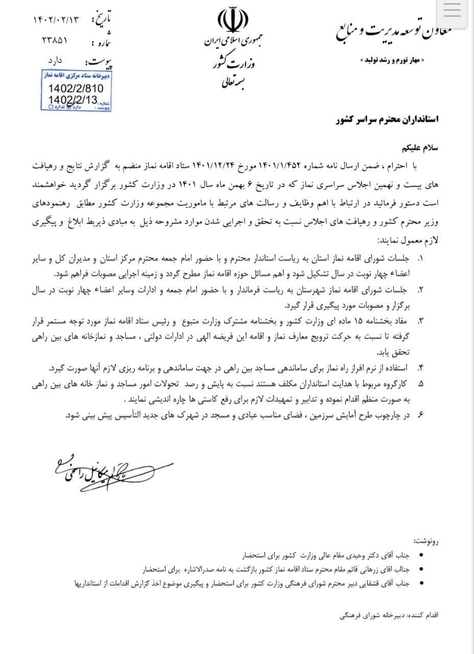 برگزاری جلسات شورای اقامه نماز استان به ریاست استاندار و و در شهرستانها به ریاست فرمانداران با حضور امام جمعه مرکز استان و مدیران کل و سایر اعضاء در چهار نوبت در سال و طرح اهم مسائل حوزه اقامه نماز و فراهم شدن زمینه اجرایی مصوبات و توجه به مفاد بخشنامه ۱۵ ماده ای وزارت کشور و بخشنامه مشترک وزارت متبوع و رئیس ستاد اقامه نماز جهت تحقق ترویج معارف نماز و اقامه این فریضه الهی در ادارات دولتی، مساجد و نمازخانه های بین راهی از موارد مطرح شده در این مکاتبه است.