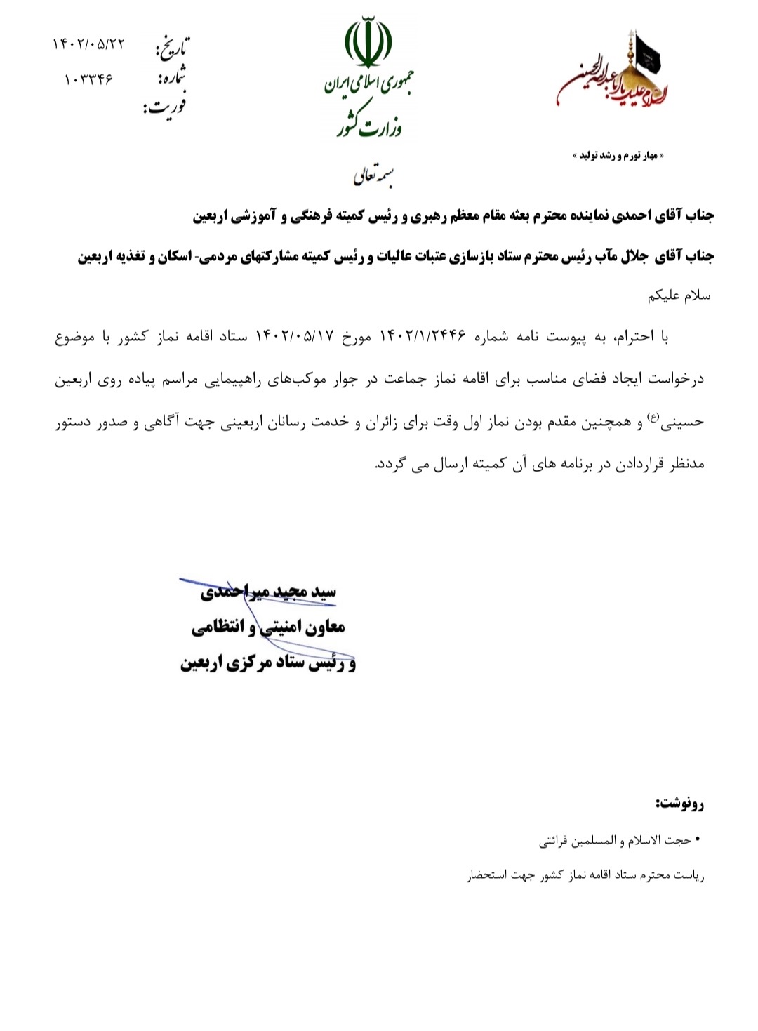 پیرو مکاتبه سید احمد زرهانی قائم مقام ستاد اقامه نماز به سید مجید میراحمدی معاون امنیتی و انتظامی وزیر کشور و رئیس ستاد مرکزی اربعین در خصوص توجه ویژه به اقامه نماز جماعت در موکب ها و نمازخانه های بین راهی در ایام اربعین، رئیس ستاد مرکزی اربعین این امر را ابلاغ کرد.