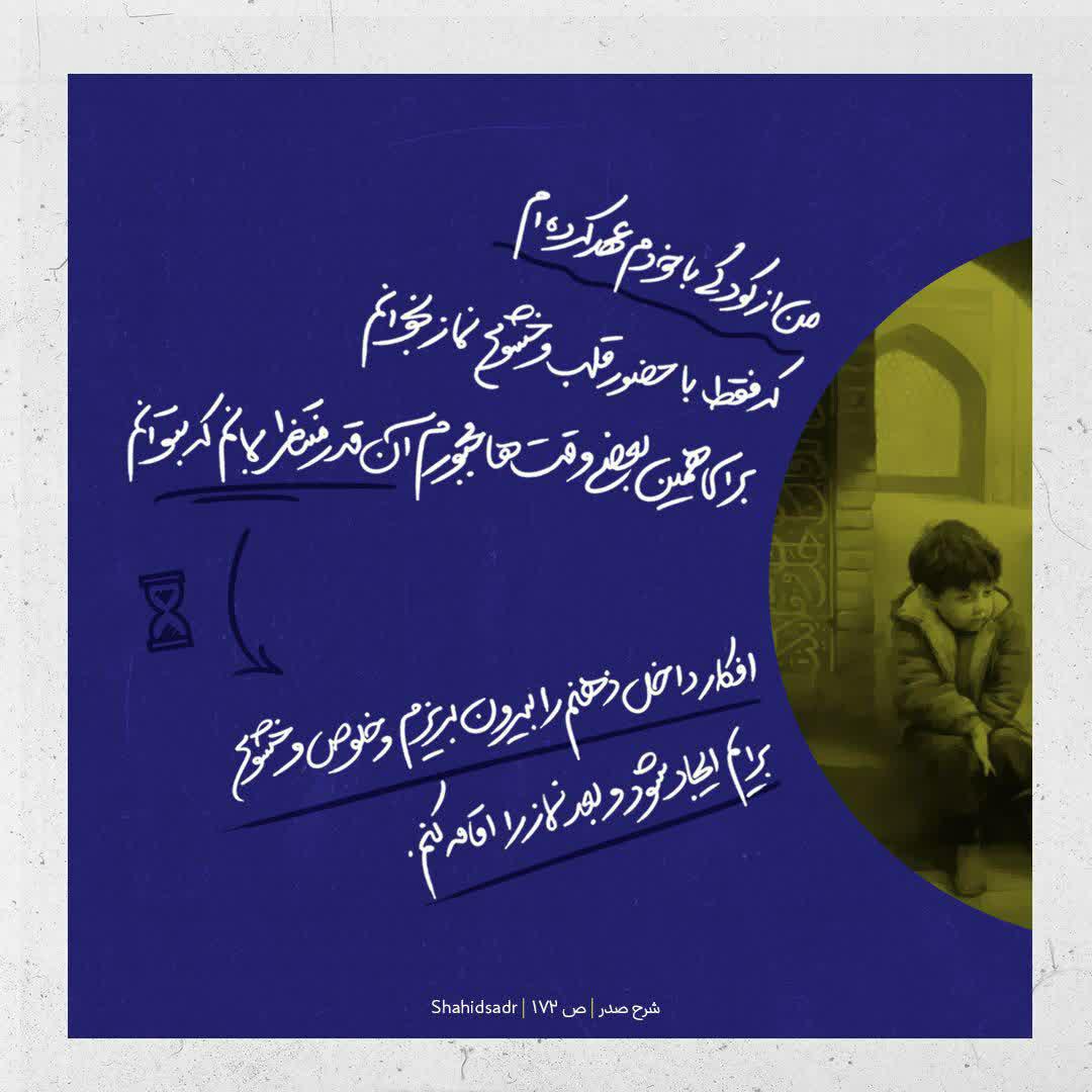 این قبیل مسائل باعث شد یک روز از ایشان بپرسم دلیل این کار چیست. شهید صدر جواب داد: «من از کودکی با خودم عهد کردهام که فقط با حضور قلب و خشوع نماز بخوانم، برای همین بعضی وقتها مجبورم آنقدر منتظر بمانم که بتوانم افکار داخل ذهنم را بیرون بریزم و خلوص و خشوع برایم ایجاد شود و بعد نماز را اقامه کنم».