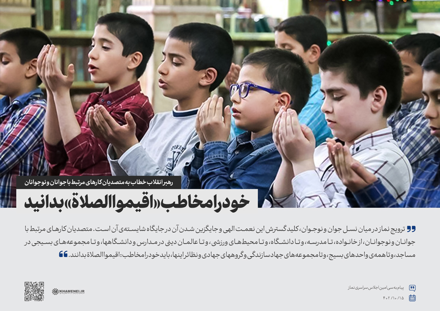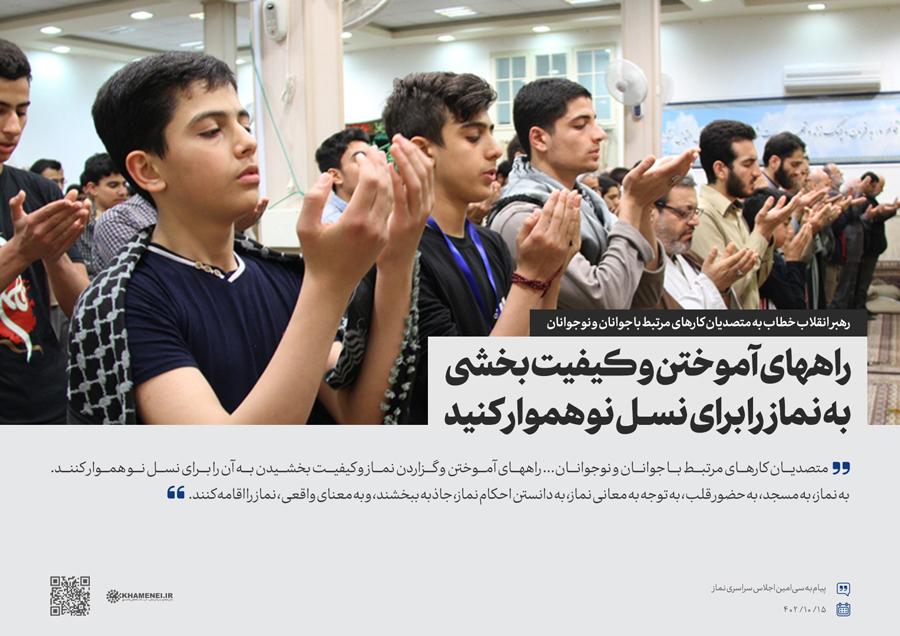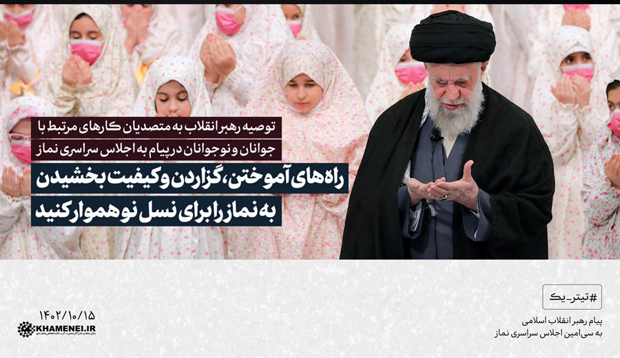 حضرت آیتالله خامنهای در پیامی به سیامین اجلاس سراسری نماز، ترویج نماز در میان نسل جوان و نوجوان را کلید گسترش این نعمت الهی و جایگزین شدن آن در جایگاه شایستهی آن دانستند و از متصدیان کارهای مرتبط با جوانان و نوجوانان خواستند تا خود را مخاطب «اقیموا الصلاة» بدانند و به معنای واقعی، نماز را اقامه کنند.