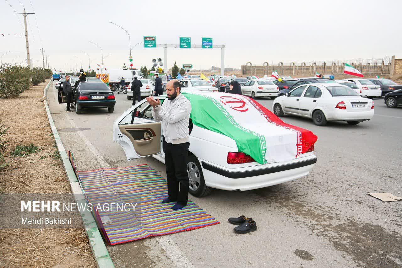 نماز اول وقت در حاشیه برگزاری راهپیمایی خودرویی ۲۲ بهمن قم