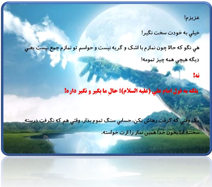 هی نگو که حالا چون نمازم با اشک و گریه نیست و حواسم تو نمازم جمع نیست یعنی دیگه هیچی همه چیز تمومه!