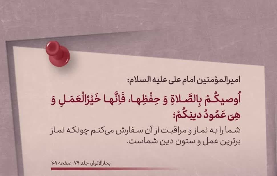 امام علی علیه السلام : اُوصيكُمْ بِالصَّلاةِ وَ حِفْظِها، فَاِنَّها خَيْرُالْعَمَلِ وَ هِىَ عَمُودُ دينِكُمْ؛ شما را به نماز و مراقبت از آن سفارش مى كنم چونكه نماز برترين عمل و ستون دين شماست. [بحارالأنوار: ج 82، ص 209 ] ...