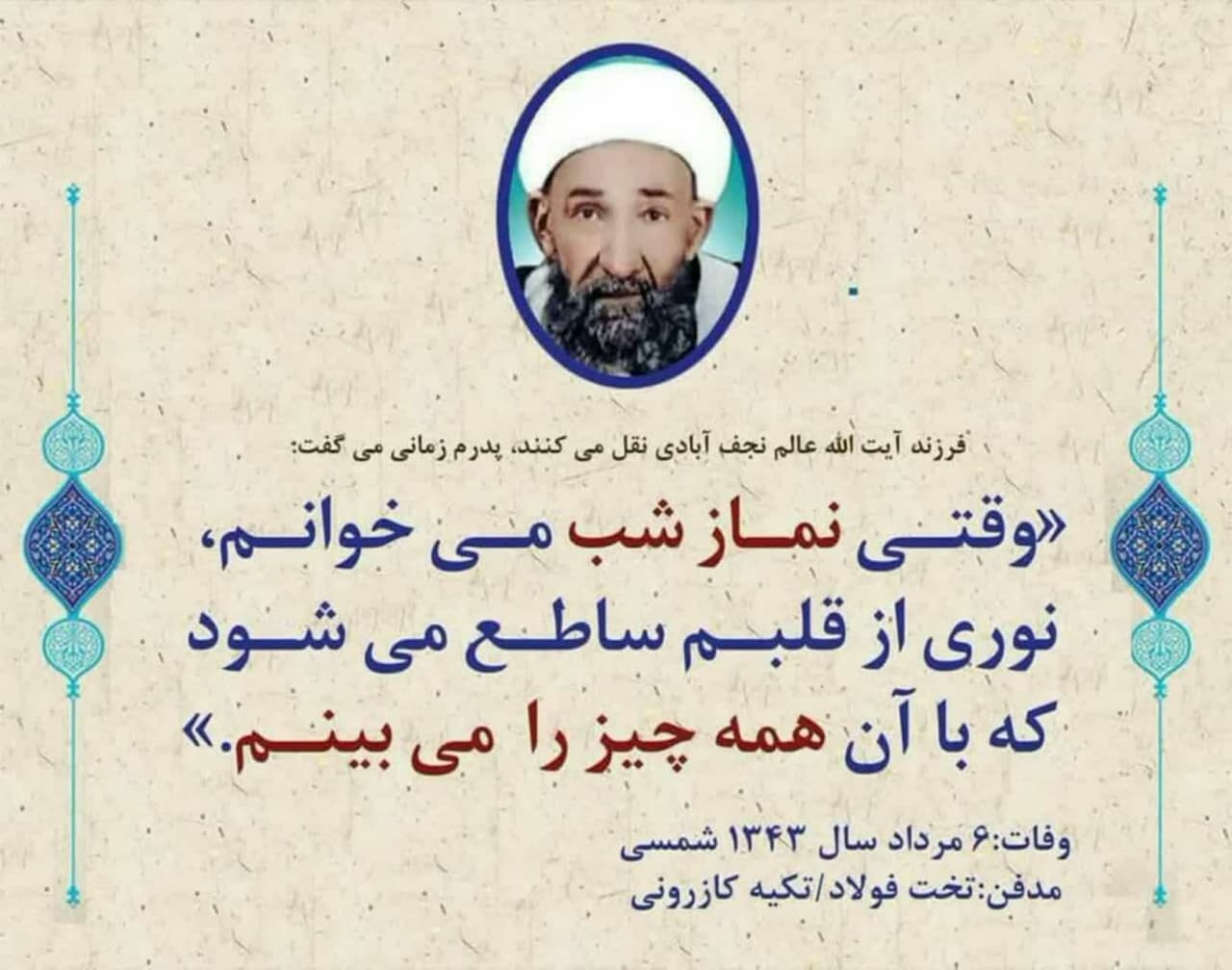 حالات آیت الله حاج شیخ محمد حسن عالم نجف ابادی(ره) در نماز شب.