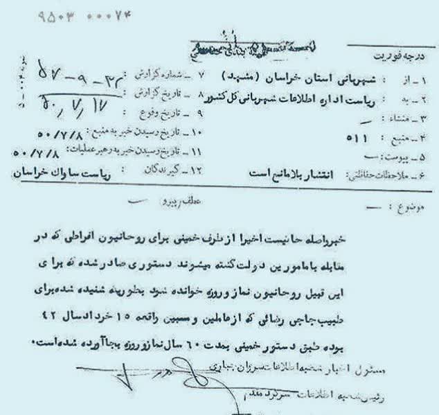 نماز شهدا؛ ۶۰ سال نماز و روزه برای طیب حاج رضایی در اسناد ساواک آمده است "شنیده شده برای طیب حاج رضایی که از عاملین و مسببین واقعه ۱۵ خرداد ۴۲ بوده، طبق دستور خمینی به مدت ۶۰ سال نماز و روزه به جا آورده شده است" ...