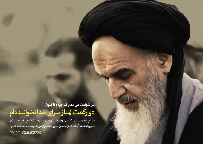 امام خمینی؛ دو رکعت نماز برای خدا نخواندهام، ((من شهادت میدهم که خودم تا کنون دو رکعت نماز برای خدا نخواندهام، هر چه بوده برای نفس بوده. دلیلش هم این است که چنانچه جنت و ناری{بهشت و جهنمی} نباشد، آیا ما باز همان طور مشغول میشویم به دعا یا خیر؟)) ...
