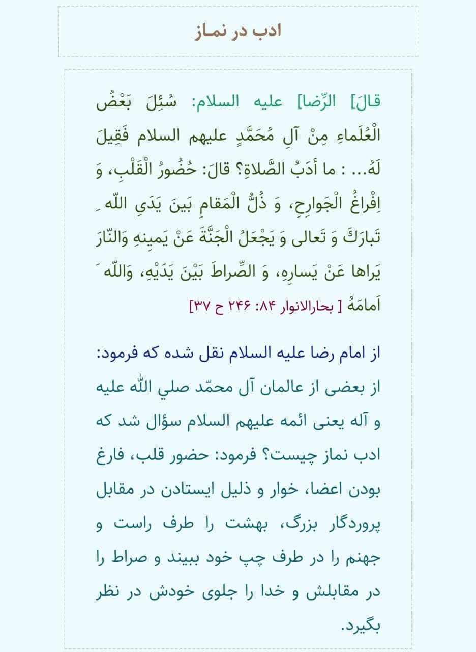 حدیث؛ ادب در نماز قـالَ( الرِّضا) عليه السلام: سُئِلَ بَعْضُ الْعُلَماءِ مِنْ آلِ مُحَمَّدٍ عليهم السلام فَقِيلَ لَهُ... : ما أدَبُ الصَّلاةِ؟ قالَ: حُضُورُ الْقَلْبِ، وَ اِفْراغُ الْجَوارِحِ، وَ ذُلُّ الْمَقامِ بَينَ يَدَىِ اللّه ِ تَبارَكَ وَ تَعالى وَ يَجْعَلُ الْجَنَّةَ عَنْ يَميِنهِ وَالنّارَ يَراها عَنْ يَسارِهِ، وَ الصِّراطَ بَيْنَ يَدَيْهِ، وَاللّه َ اَمامَهُ از امام ...