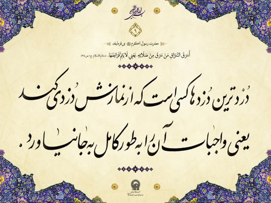حدیث ؛ دزد نماز پيامبر خدا صلى الله عليه و آله : أسرَقُ السُّرّاقِ مَن سَرقَ مِن صَلاتِهِ، يَعني لا يُتِمُّ فَرائضَها . ترجمه: دزدترين دزدها كسى است كه از نمازش دزدى كند، يعنى واجبات آن را به طور كامل به جاى نياورد. دعائم الإسلام : 1/135 ...