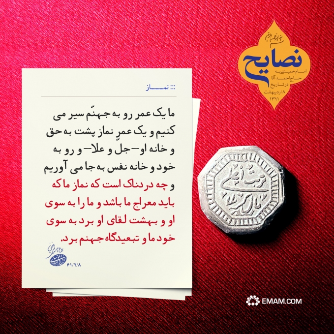 امام خمینی (ره) : نماز رو به جهنم ! ما یک عمر رو به جهنّم سیر میکنیم و یک عمر نماز پشت به حق و خانه او- جلّ و علا- و رو به خود و خانه نفس به جا میآوریم و چه دردناک است که نماز ما که باید معراج ما باشد و ما را به سوی او و بهشت لقای او برد به سوی خود ما و تبعیدگاه جهنم برد. امام خمینی (ره) ۸ اردیبهشت ۱۳۶۱ ...