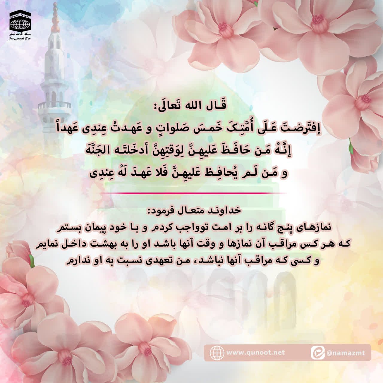 پیمان آسمانی پیامبر اعظم (صلی الله علیه و آله): قَال الله تَعالَی: إفتَرضتَ عَلَی أُمَّتِکَ خَمسَ صَلواتٍ و عَهدتُ عِندِی عَهداً إنَّهُ مَن حَافَظَ عَلیهِنَّ لِوَقتِهِنَّ أدخَلتَه الجَنَّهَ و مَن لَم یُحافِظ عَلیهِنَّ فَلا عَهدَ لَهُ عِندِی ترجمه خداوند متعال فرمود: نمازهای پنج گانه را بر امت تو واجب کردم و با خود پیمان بستم که هر کس مراقب آن نمازها و وقت آنها باشد، او را به بهشت داخل ن ...