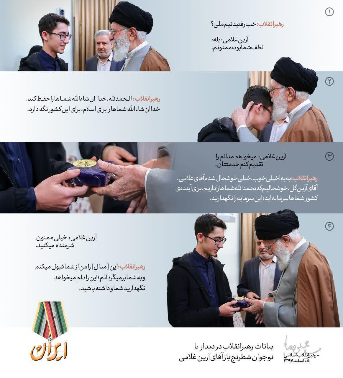 آرین غلامی، شطرنجباز نوجوان تیم ملی جمهوری اسلامی ایران که در مسابقات بینالمللی اخیر از رویارویی با حریفی از رژیمصهیونیستی امتناع کرده بود، ظهر امروز (یکشنبه) به همراه خانواده خود با حضرت آیتالله خامنهای رهبر انقلاب اسلامی دیدار و گفتگو کرد و مورد تقدیر ایشان قرار گرفت. ۹۷/۱۲/۵